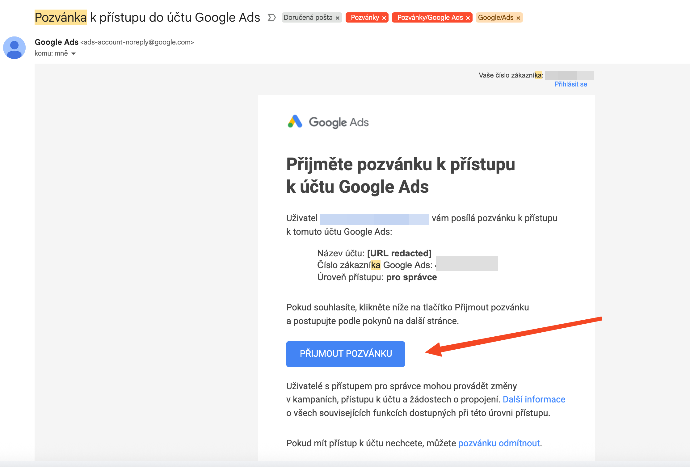 Pro propojení od vás budeme potřebovat číslo účtu vašich Google Ads, které najdete v pravém horním rohu
