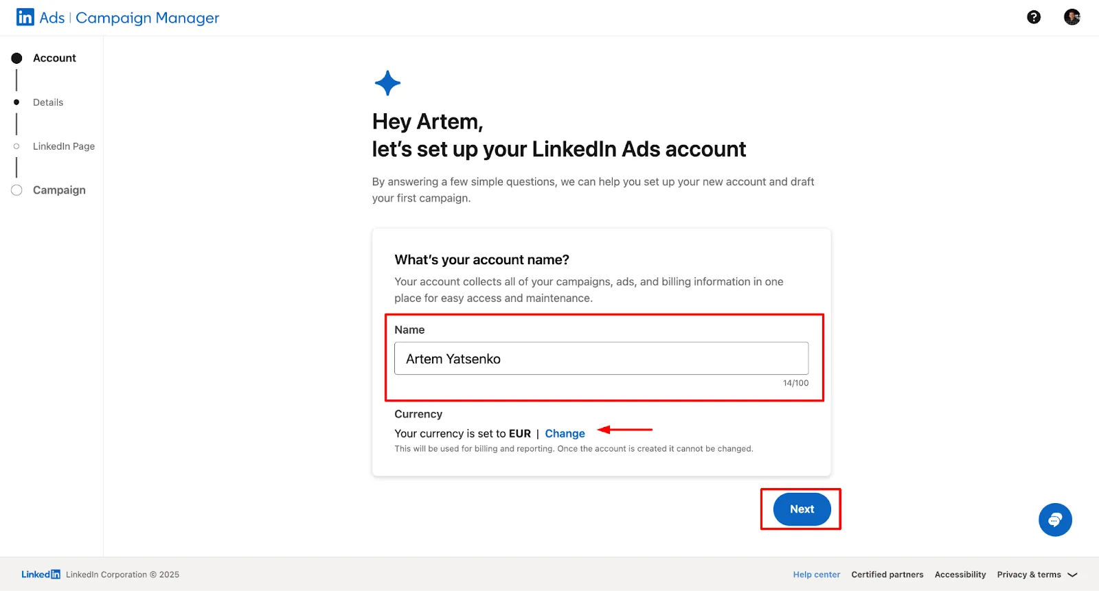 Přejděte na odkaz https://www.linkedin.com/campaignmanager/accounts a vytvořte reklamní účet. Zadejte název vaší firmy a měnu (doporučujeme EUR). Následně uložte všechny změny.