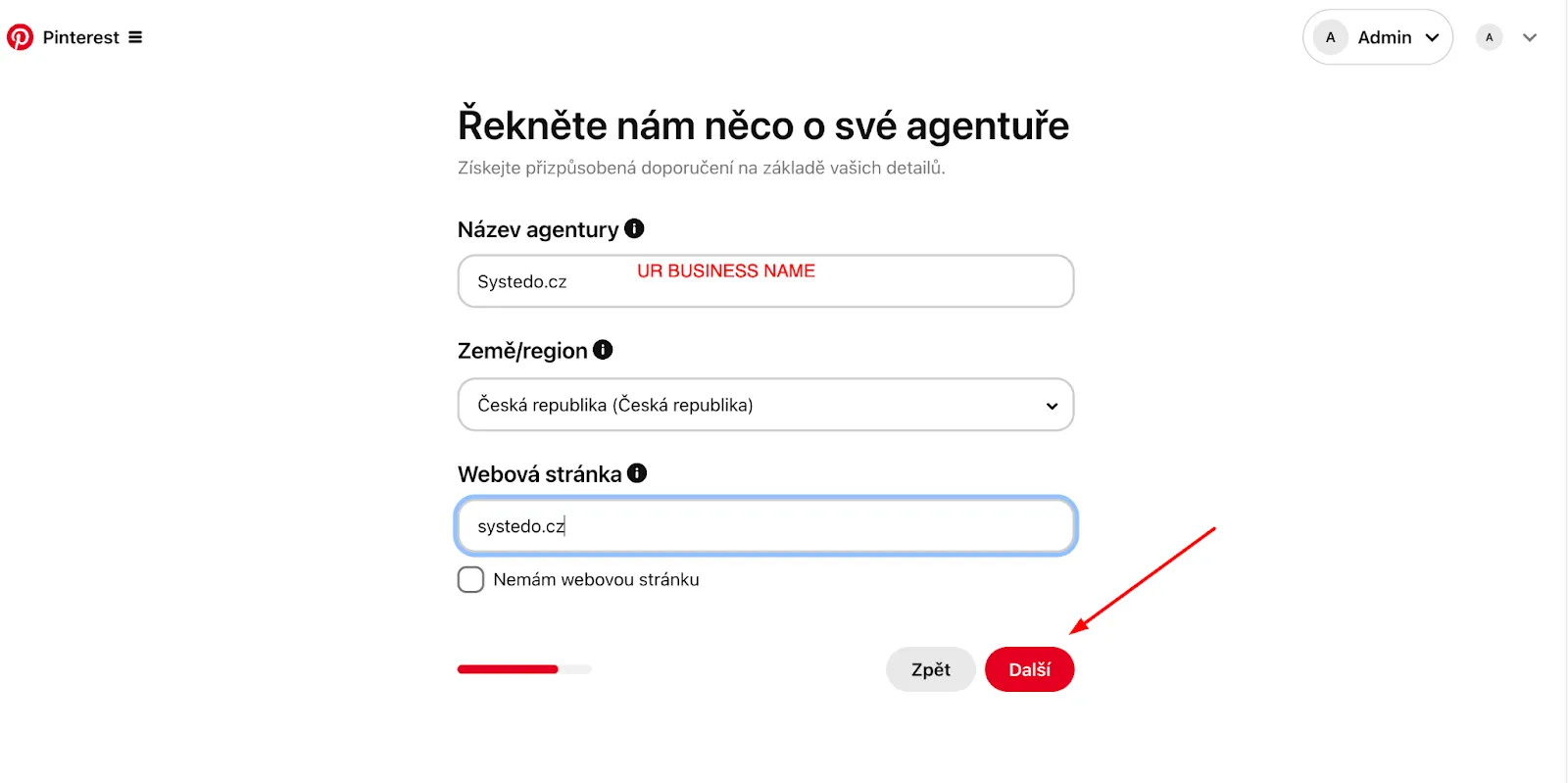 V dalším kroku musíte vyplnit základní informace o své firmě. Obvykle se jedná o název společnosti, region, odkaz na vaše webové stránky.