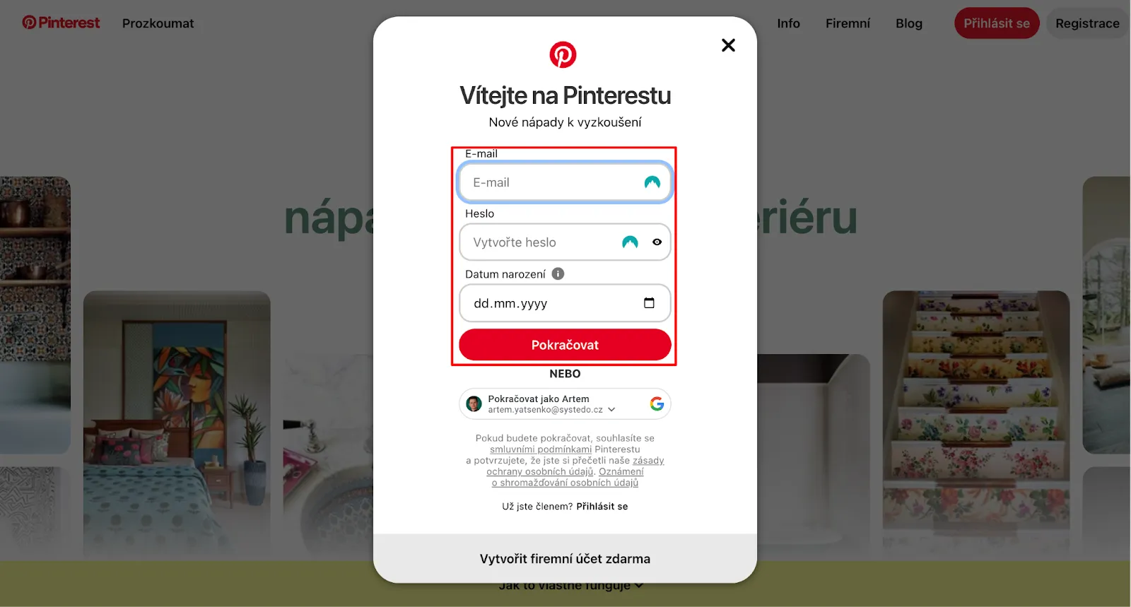 Za tímto účelem klikněte na tlačítko Registrace a zadejte své údaje (e-mail, heslo, datum narození).